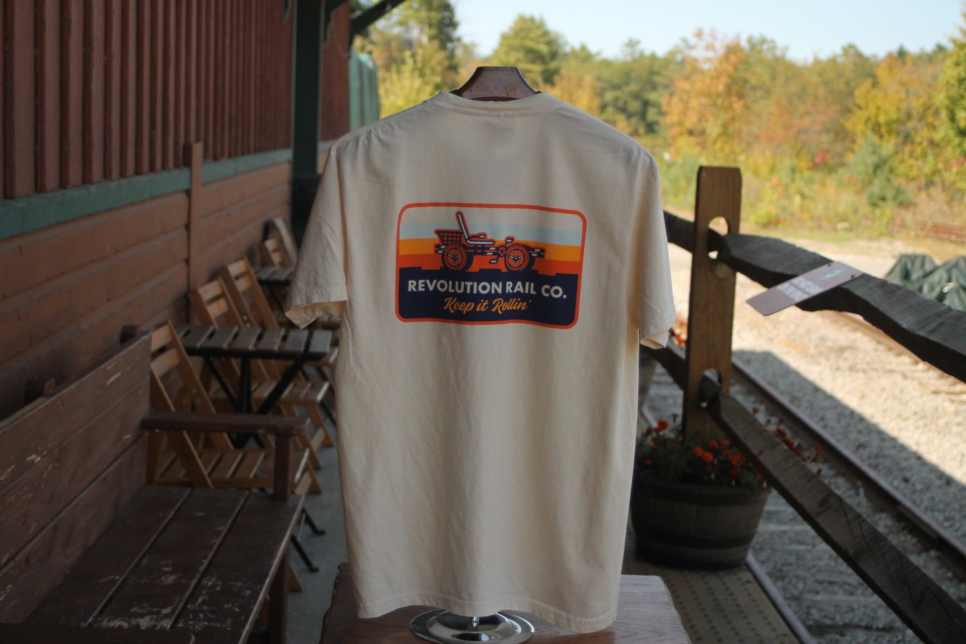 Ride in style with this ultra-soft, 100% cotton Comfort Colors® pocket tee. Featuring our classic Revolution Rail Co. logo on the front pocket and the bold “Keep it Rollin’” railbike design on the back, this shirt is perfect for your next railbiking adventure or for relaxing after the ride.